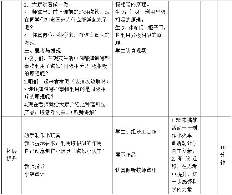 学生能够知道磁铁的相同磁极相互排斥,不同磁极相互吸引。磁极间的作用是相互的。