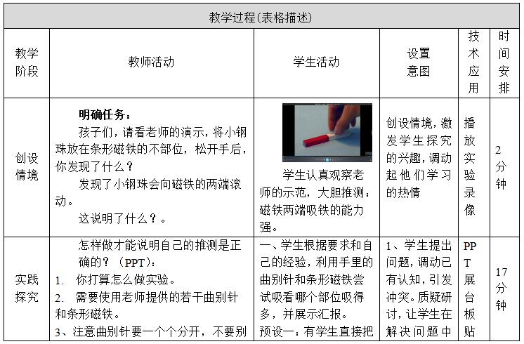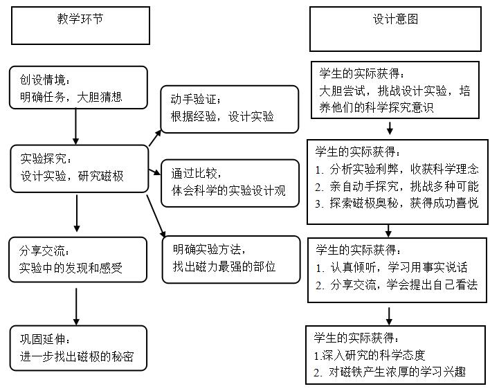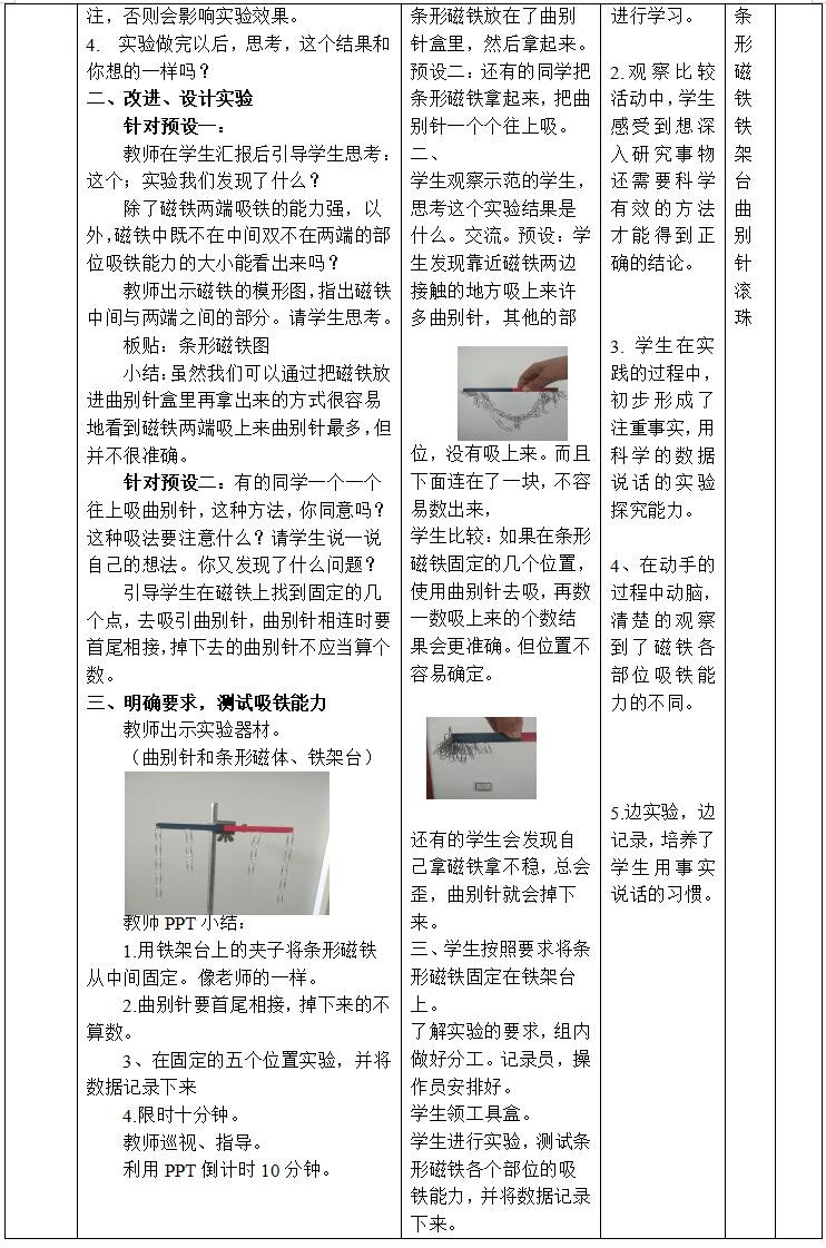 教学重点:学生通过实验探究,了解磁铁哪些部位的吸铁能力最强,以及磁铁有指示方向的性质。