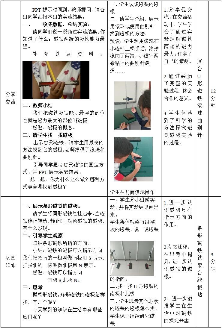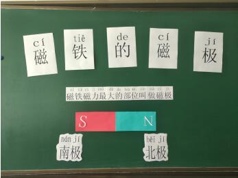 学生通过动手实验,知道磁铁上磁性最强的部位叫作磁极;一块磁铁上总是同时存在着两个不同的磁极;南极和北极。
