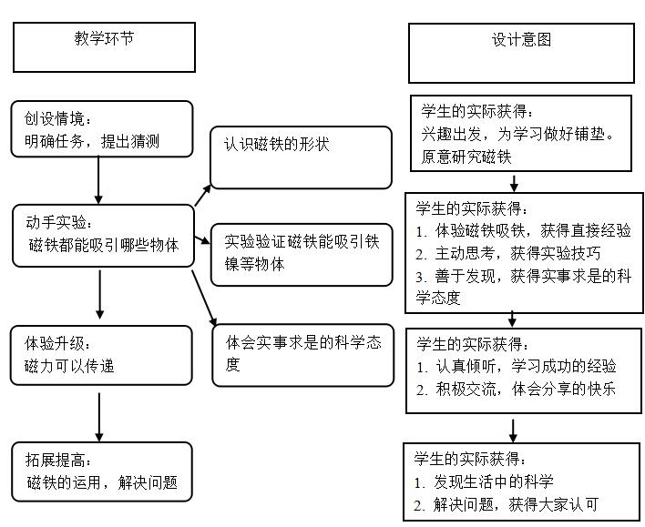 学生在生活中经常遇到磁铁,但是系统的学习还是第一次,本课的学习在学生原有的认知基础上,进一步强化了科学概念,为后面的学习打下良好的基础。学生原来认为只要是金属磁铁就可以吸引,通过自己动手尝试过程中,体验磁铁能吸引哪些物体,教师及时的加以总结,改变了原有的认知。通过一系列的实验激发了学生探索科学的兴趣、热情。孩子在玩中学、做中学,经历了一次从生活中发现并提出问题--作出假设--实验验证--得出结论--生活运用这样一个完整的探究过程。满足了学生一次探究的愿望,也给他们带来了成功的获得感。