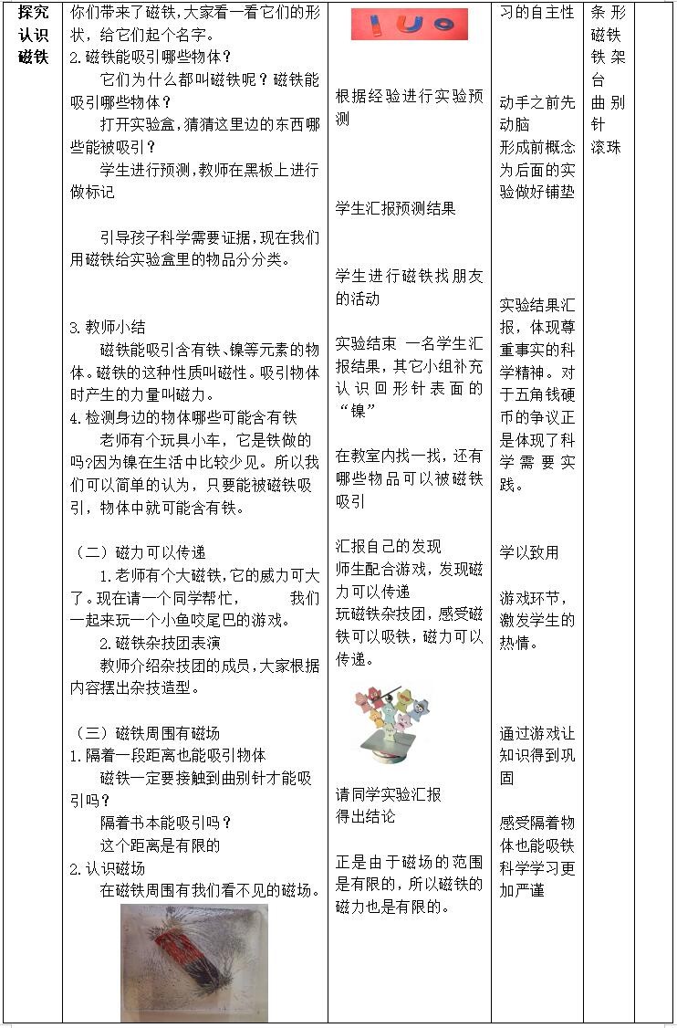 对探究磁铁的特性持续表现出兴趣,培养学生尊重事实的精神。对探究活动表现出兴趣并积极投入。能如实讲述观察到的实验现象,尤其当事人与自己原有的想法不同时,能尊重事实,养成用事实说话的意识。愿意倾听别人的发言,乐于表达自己的观点。