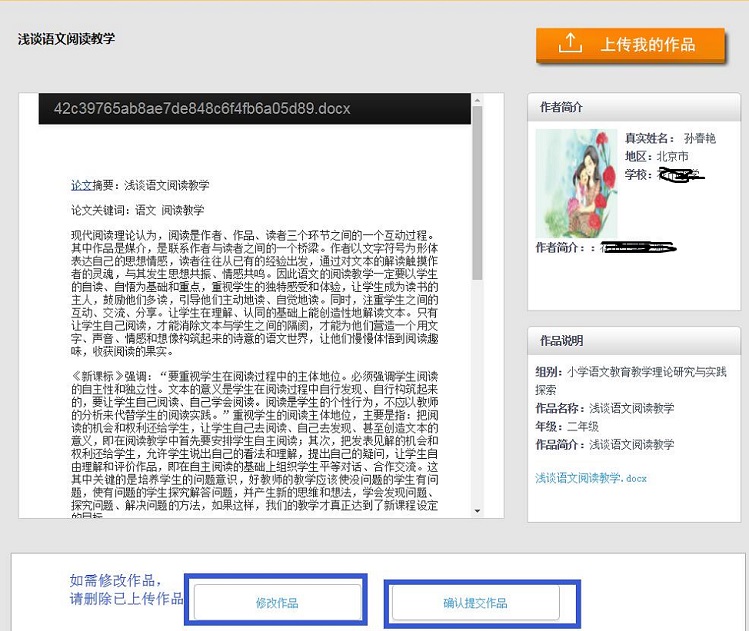 4.进入预览及确认页面,您可预览上传的作品。若有问题需要修改,点击下方左侧的“修改作品”;若确认没问题,点击右侧“确认提交作品”。